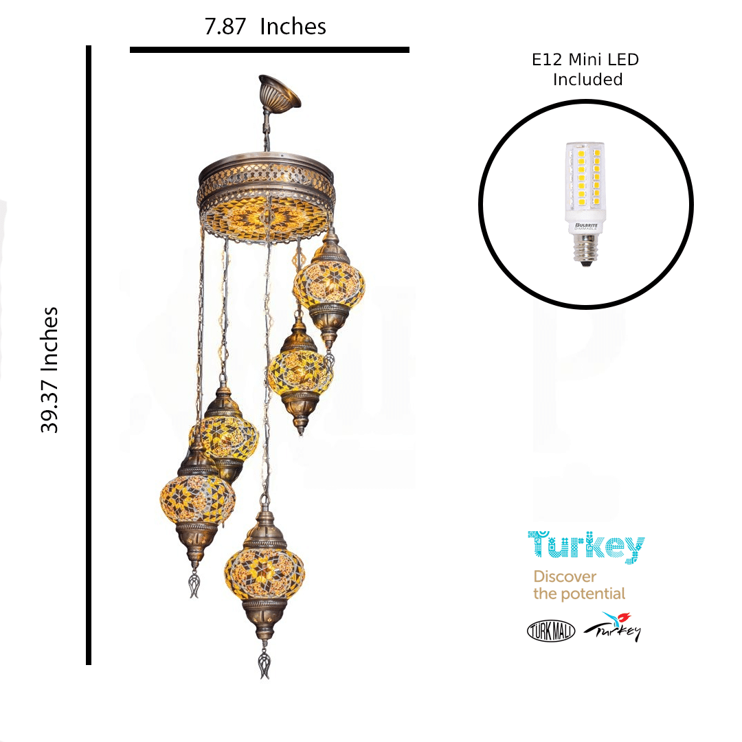 The 5 Balls Turkish Mosaic Water Drop Chandelier is a glowing cascade of tradition and elegance, designed to enchant with every glance. Each of the five handcrafted mosaic globes features warm amber tones and intricate navy blue star patterns, skillfully arranged to capture the essence of Anatolian artistry. As light passes through the vibrant glass, it creates a soft, golden ambiance reminiscent of lantern-lit Turkish evenings.