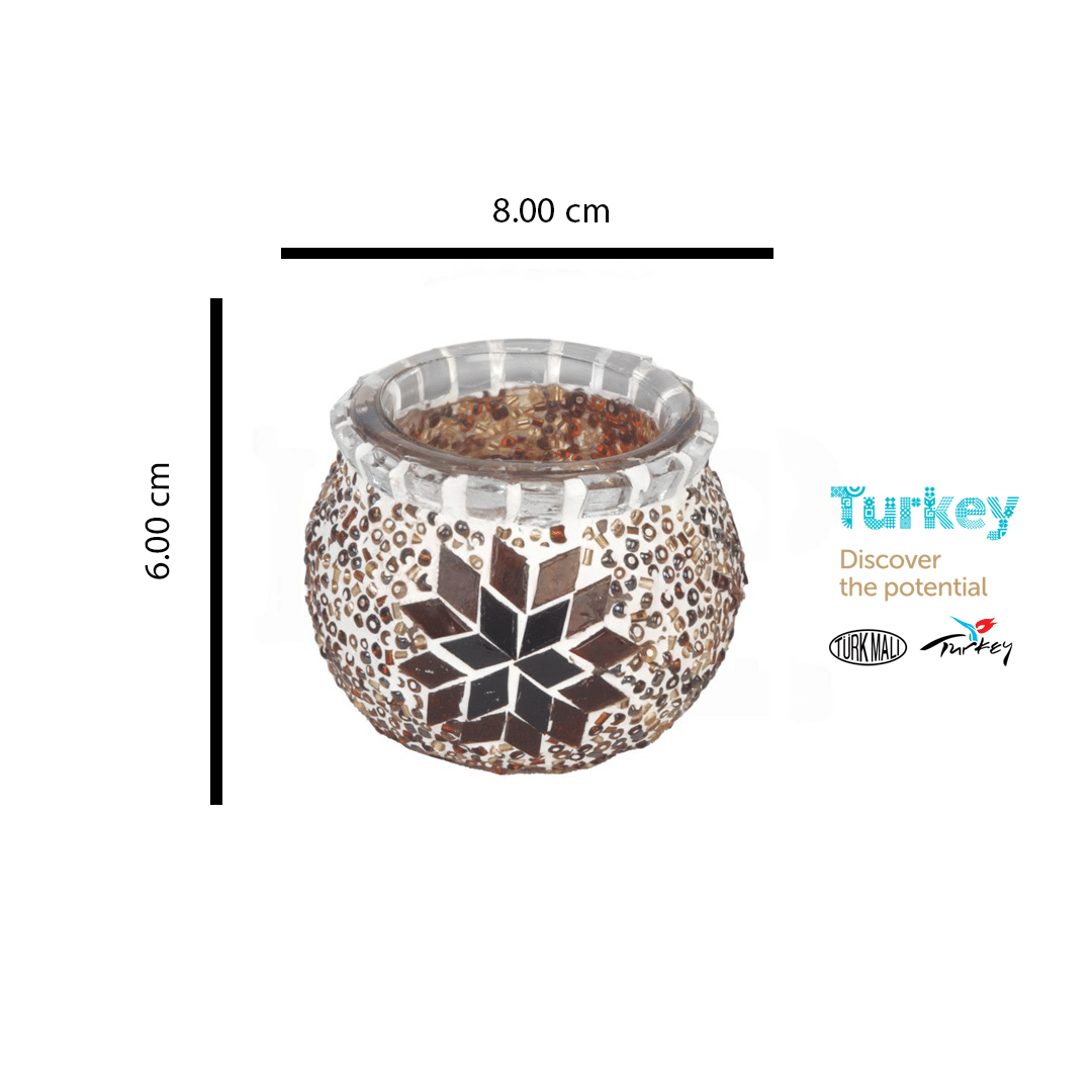 Add a subtle touch of charm and cultural elegance with our Mini Turkish Mosaic Candle Holder. Expertly handcrafted in Turkey, this exquisite piece features a star-shaped mosaic design in neutral tones of brown, black, and white, perfect for complementing any decor style.